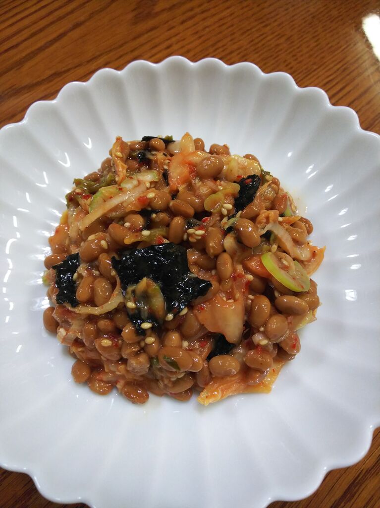 キムチ・納豆(付属のタレも)・ごま油・白だし・薬味を混ぜ混ぜして出来上がり。