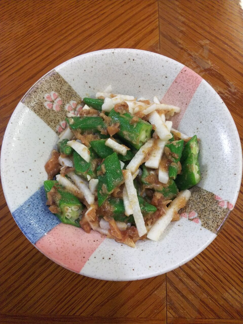 ボウルに長芋とオクラと梅肉とかつをぶしを投入し、和えたら出来上がりです。