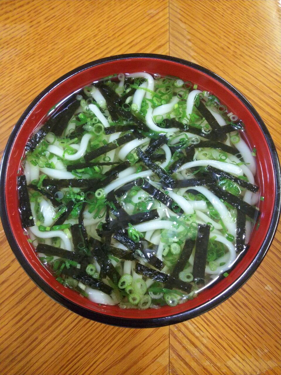 熱くした白だしをかけて、小ねぎと細切りした海苔をたくさん投入したら出来上がり。