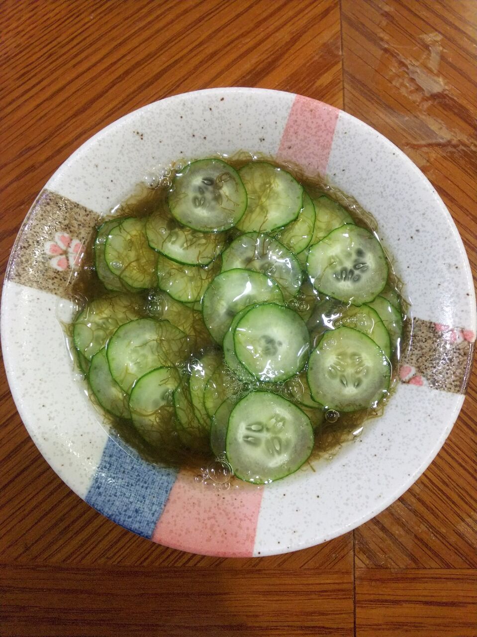 器にきゅうりを盛り、もずく酢で和えて出来上がり。