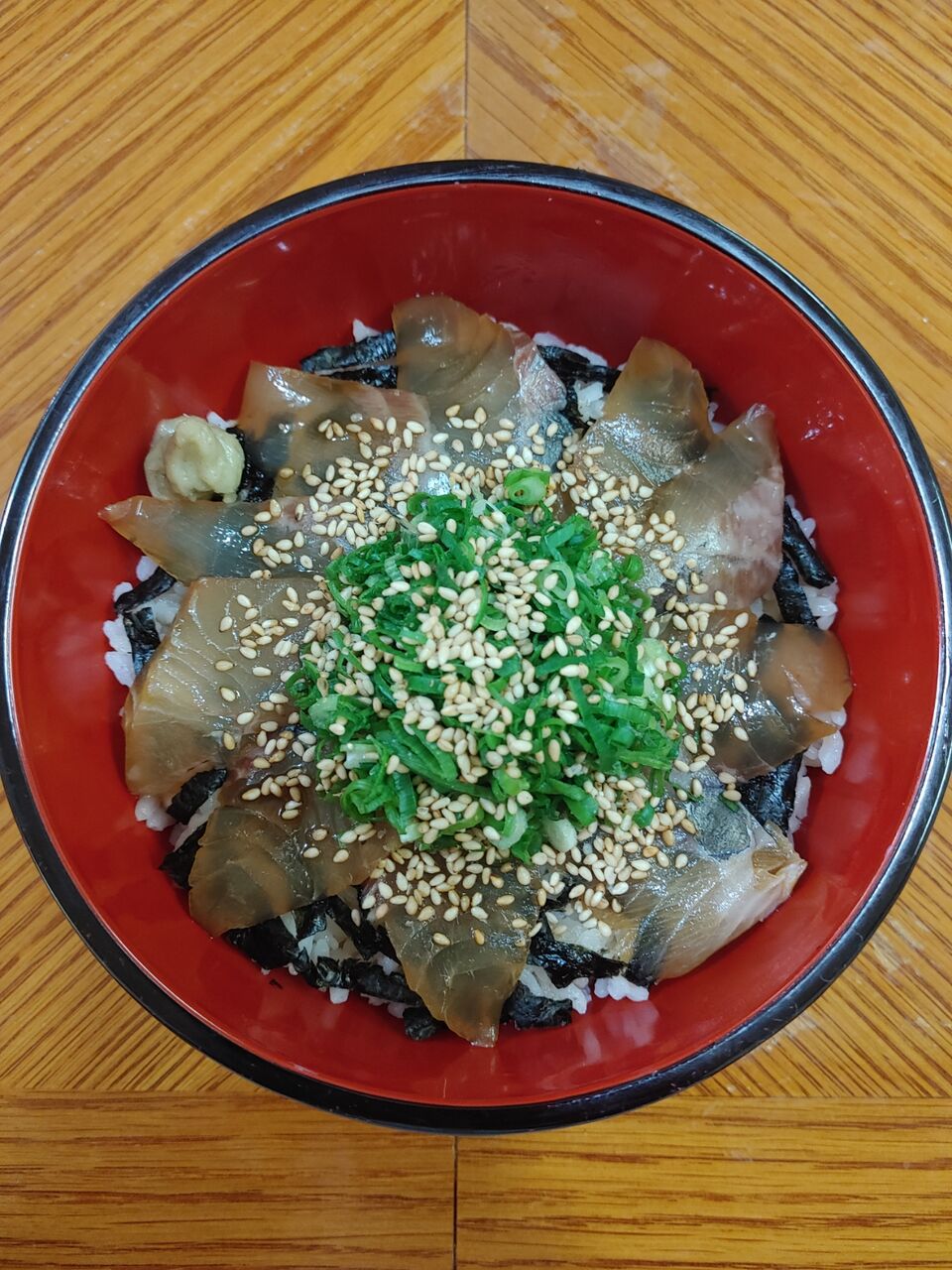 切った海苔をご飯に散らし、漬かったオキアジの刺身をのせて、漬けダレを少々かけてから好きな薬味を添えるなり散らすなりして出来上がり。