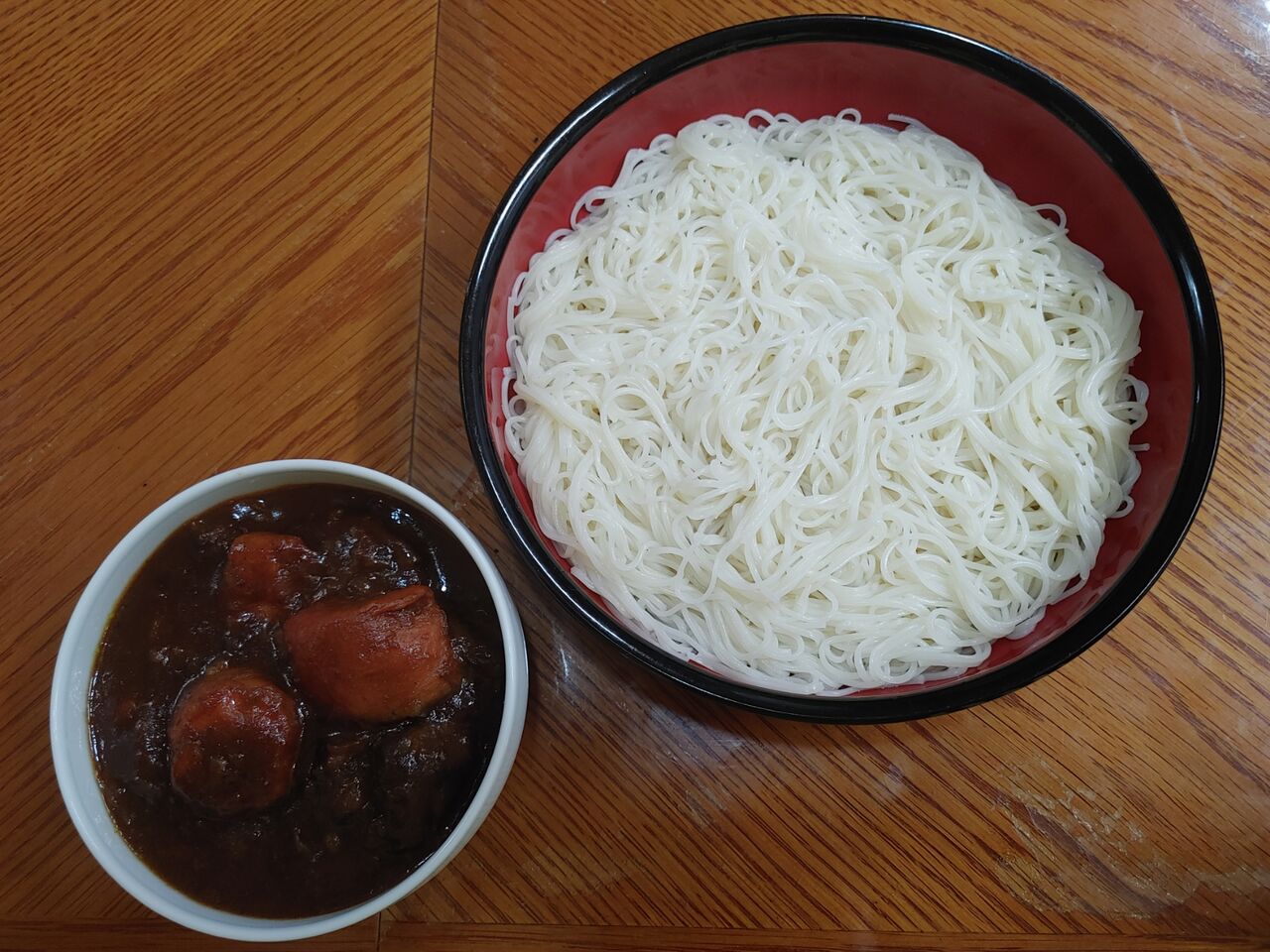 便宜上カレーを作るところから手順を書きましたが、要するに残り物のカレーを使った、つけカレーうどん(そうめん)です。